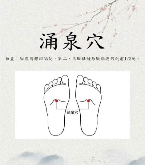 按揉涌泉:位于足底前部凹陷处。每晚睡前搓热双手,用手心来回搓揉脚心涌泉穴,直至发热。此乃肾经起点,能引火下行,温暖双脚。