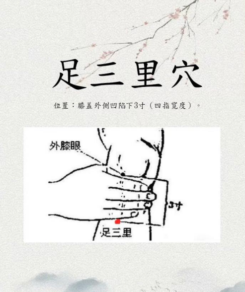 拍打足三里:位于外膝眼下四横指。常按揉或艾灸此穴,可健脾胃、补中气,是强壮身体的保健要穴。